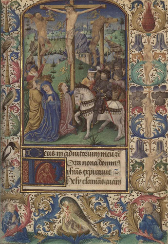 Pellicano nutre la prole, codice Horae ad usum Pictaviensem, 1455-1460, fol. 67r, particolare della decorazione inferiore, Francia, Bibliothèque nationale.