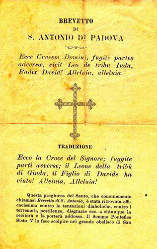 Le condizioni della donna, presentata come vittima di vessazioni demoniache, conferiscono a questa preghiera il marchio di un esorcismo. Queste le parole che la tradizione riferisce siano state di sant'Antonio: «Destati, o donna, e custodisci questa preghiera che ti dono, la quale ti libererà da ogni vessazione diabolica». Anche noi possiamo usare questa breve preghiera, in latino o in italiano, per aiutarci a superare le vessazioni e le tentazioni che sono presenti nella nostra vita.